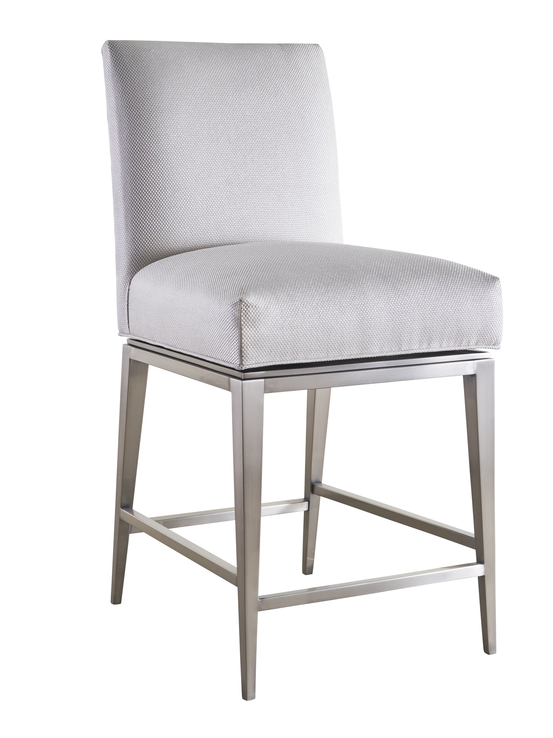 The Barnwell stool has the same features as the Barnwell chair having a simple, tailored upholstered seat that attaches to the metal base by the memory swivel. The base recesses underneath the seat part giving the illusion the seat is floating over the base. The metal base is well scaled having long tapered legs and delicate stretchers that are finished in a beautiful, plated Antique Silver finish. This stool is also available in Antique Bronze and Oil Rubbed Bronze finishes.Read More