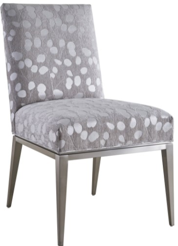 Metal base upholstery is growing in popularity in home furnishing decor. Our Barnwell metal base side is sophisticated in style having a simply tailored upholstered to chair part that attaches to an intricate metal base. The base recesses underneath the chair base creating an illusion of the chair floating over the metal base. The metal base has beautifully scaled tapered legs and is finished in an Antique Silver finish. Also available in Antique Bronze and Oil Rubbed Bronze.Read More