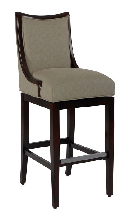 The Blanchard dining stool is a beautiful stool that combines the warmth of exposed wood with the softness of upholstery. The exposed wood top rail is scooped in the center. The exposed wood flows across the top of the stool, and down the sides to frame the outside of the tightly upholstered seat. The inside back upholstery is framed by an inset welt. The outside back upholstery wraps around the back of the stool back posts and covers the outer sides underneath the disappearing arm. The outside back upholstery is also framed with inset welt. The Blanchard upholstered seat features sinuous wire springs and is attached to the exposed wood base by memory swivel. The exposed wood base has tapered legs with stretchers that are between the front and back leg posts on all sides. A metal kick plate, available in three finishes, is centered on the front stretcher., The stool is shown in a solid quilted linen blend fabric in a putty grey color, Tudor standard finish and brushed aluminum kick plate. In combining exposed wood with the upholstery on this stool, the elements not only give beauty and warmth to the stool; the wood also adds a functional element that can help protect the fabric when handling the stool. The Blanchard dining stool is available in both counter and bar heights.Read More