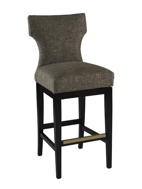 The Brunswick is a Klismos style stool with a rectangular seat. The T-shaped back with gently curved top rail is tightly upholstered. The tightly upholstered seat has sinuous wire spring construction and attaches to the stool base with a memory swivel mechanism. The exposed wood base has tapered legs and stretchers on all sides. The interior top corners of the wood base are sealed with corner wood brackets. The dining stool is available with a choice of either a brass or brushed nickel finish kick plate.Read More