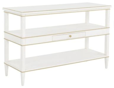 This versatile and storage-friendly collection includes a 24" square and 24" round end tables with pull out shelves and drawer, cocktail table with one drawer, and a console table with one drawer. Camille is stocked Linen or available in 40+ additional custom finishes via our Monogram Program.
