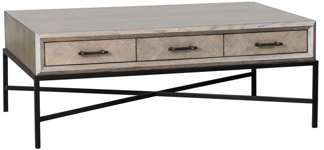 A low table designed with a rectangular wood case veneered in richly figured eucalyptus. Three storage drawers on one side with cast brass hardware and a cast iron base with linear corner legs joined by a low X-stretcher. Optional contrast finish on drawer fronts available.Read More