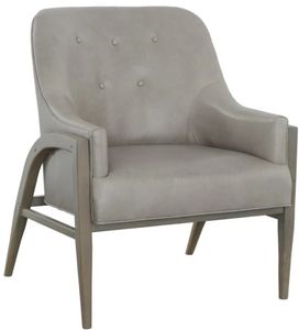 This occasional chair has a barrel shaped back accented with buttons. The tight seat fits between arms with exposed wood shaped in a dramatic arch also forming the legs. The flare of the wood legs and the clean lines of the upholstery give this chair its distinctive look.