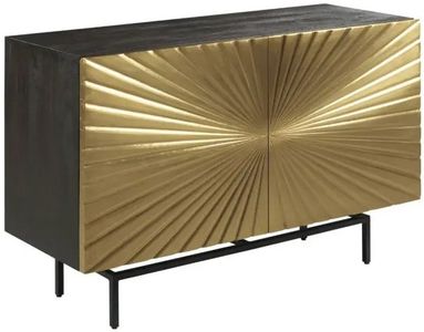 Mango Solid wood with dimensional doors covered in gold foil and a black metal base. One adjustable interior shelf behind each door.