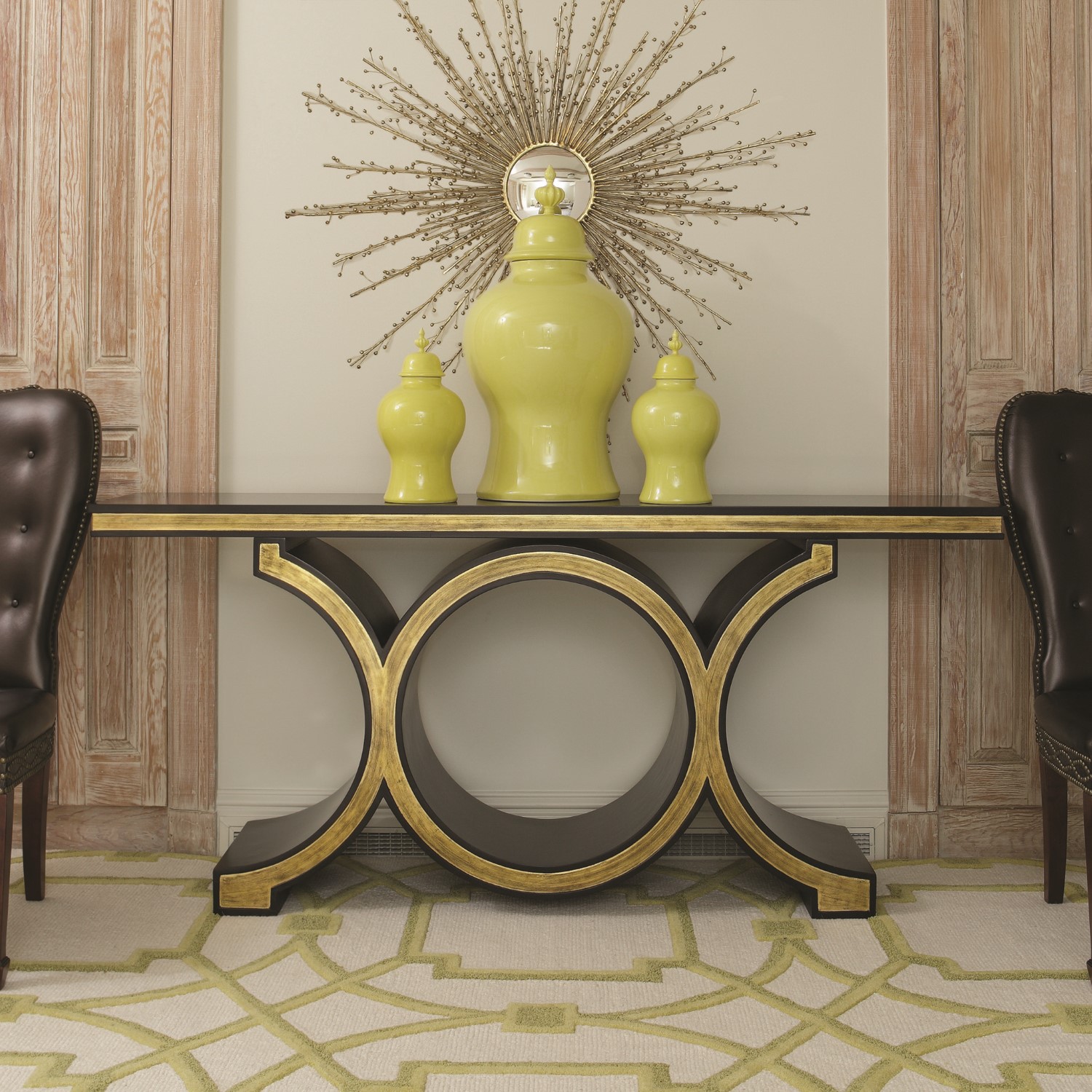 This stunning console would mix in beautifully with a traditional or contemporary environment. It is finished in satin black lacquer and gold metal leaf.Read More