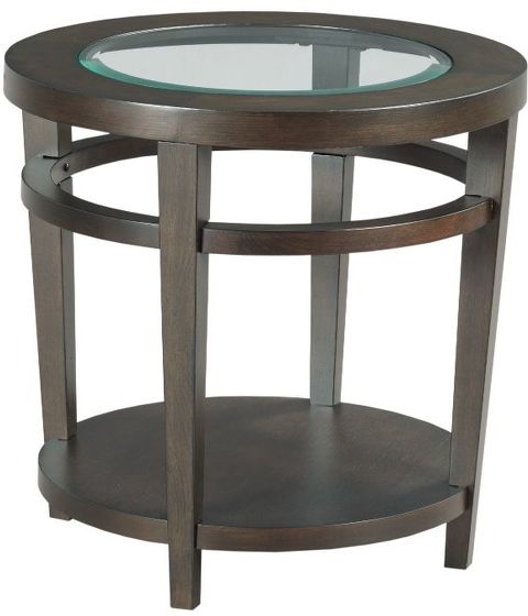 Round end table is crafted of hardwood solids and quartered oak veneers with tempered glass inserts in a dark oak finish. It is both urban chic and suburban practical with the alluring lines and wood shelf on the bottom for display.Read More