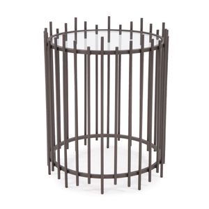 Urban decor has often taken its lead from industrial elements of the past. This side table is no exception. Vertical iron bars surround the round table frame. The graphite finish enhances this unique, industrial look. The table surface is a clear tempered glass offering a distinct modern style.Read More
