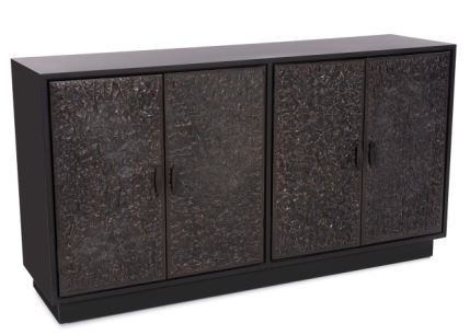 The texture of the metal cladded doors on the Glenn Credenza Cabinet stem from 1950's paper art. Finished in deep, rich bronze, these doors open to reveal the style and function of a sophisticated bar. The cabinet features a black interior with shelves for mass storage. It sits on a wood base.Read More