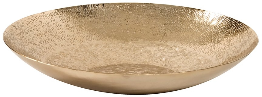 This unique charger is fashioned from metal and features a chiseled texture. It is finished in a metallic gold. Console tables, book shelves, desks or any other place that an accent is needed, are the perfect places for this decorative bowl.Read More