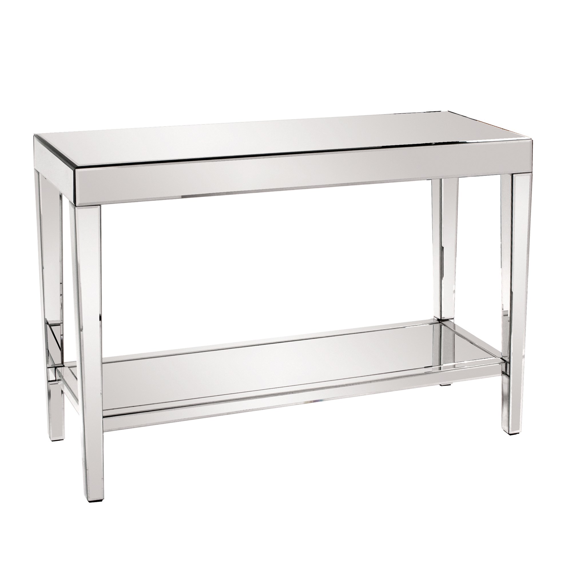 This console table features a simple rectangular shape with a completely mirrored body. The entire piece is mirrored making for the most beautiful displays of light and reflection. It has a bottom shelf for extra storage. Each mirrored panel has a small bevel that adds to the table's style and beauty. This contemporary table will look great in an entryway, hallway, living room or any place you need a console table!mplete look!Read More