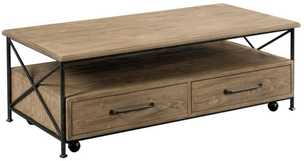 The Kincaid® Modern Forge Sandy Brown Coffee Table with Black Frame blends rustic warmth and industrial character. Crafted from sand-blasted poplar in a sandy brown finish, it features a sturdy black metal frame, two drawers, and a lower shelf for storage, bringing function and charm to any living space.Read More