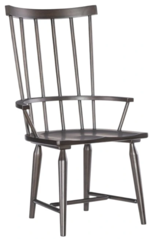 The Legacy Classic Fenmore spindle dining arm chair features a sleek, dark metallic finish. With its classic spindle back, curved armrests, and sturdy legs, it blends traditional elegance with modern durability, perfect for sophisticated dining spaces or rustic settings.Read More