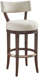 The Giles swivel bar stools feature an upholstered seat and back, memory swivel mechanism, and a decorative metal kickplate finished in rose gold. The stools are standard in fabric 2304-11 Biscayne, but are available in custom fabric, leather, or COM.Read More