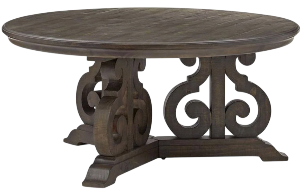 Old World charm abounds in the Bellamy table collection. Gracious S-curved carved bases support overlaid solid pine tops finished in vintage-inspired Deep Weathered Pine. Matte black with pewter highlights metal stretchers and hardware create the perfect accent to set the mood for stunning European-influenced elegance.Read More