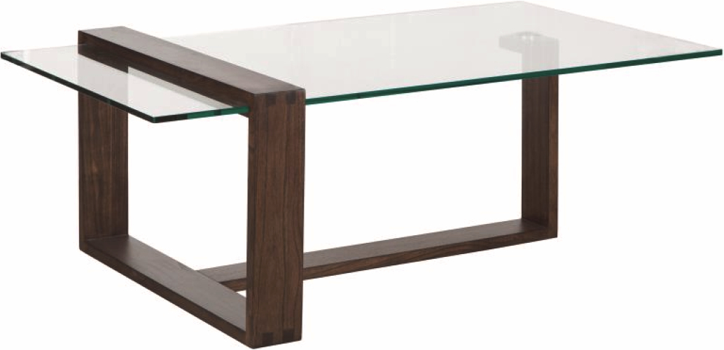 A chunky wood rectangle overlaps the top at one end as the other understated rectangle base rests underneath on the conversation worthy cocktail, impressive open sofa table and the rectangular end table with geometric appeal that delightfully complement contemporary living spaces.