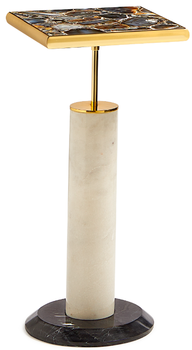 This side table features a polished agate top trimmed in shiny cast brass, a Banswara marble post, and a black granite base