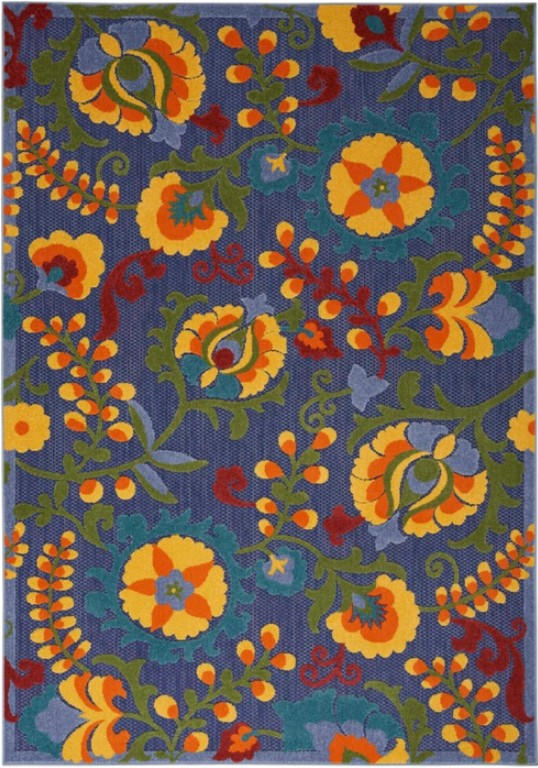 The bold, swirling vines and flowers of this Aloha outdoor rug bring a stunning pop of pattern to your patio, porch, deck, or swanked out yard. A high-low weave, presented in soft shades of blue, yellow, green, and red. combines textural patterns with an intricately woven base for exceptional look and feel.Read More