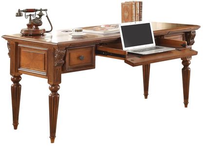 The Huntington writing desk adds a stunning focal point to your room and creates a functional workspace. A signature piece in the Huntington collection, it makes working from home stylish and enjoyable. This desk includes a power center to keep cords out of sight, storage drawers, and a drop-down drawer perfect for a keyboard. An antique vintage pecan finish highlights its carved detailing.Read More