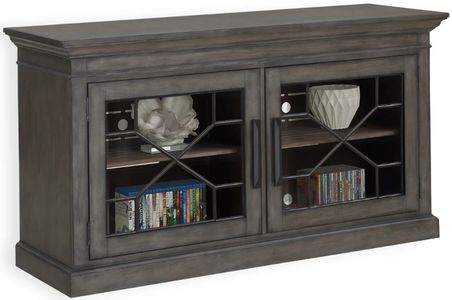 Displaying your television in style has never been easier than with the easygoing elegance of this 63-inch TV Console from the Sundance collection. Its stunning hand-applied, multi-step Smokey Grey finish complements any room's décor while adding updated styling and a touch of rustic character. Two glass doors with decorative insets provide room for both storage and display.Read More