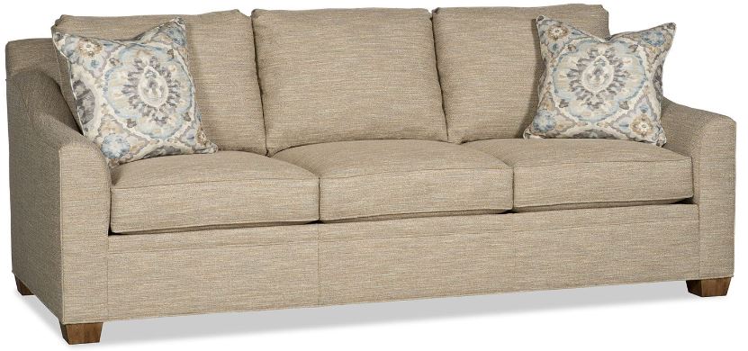 Our 35 sofa is known as a Bridgewater style, meaning that it has low, shaped arms that are set back slightly from the seat cushions. It’s one of our top 10 frames and maybe that’s because the loose back and seat cushions provide just the right amount of ease for relaxation. That’s a lot of talk and we haven’t even gotten to all of the customized options – hence the name “Choices”. Two seat depths, custom lengths, eleven arm designs, three back styles, skirt or two leg bases, three nail patterns, and a slipcover option are available to create your original sofa.