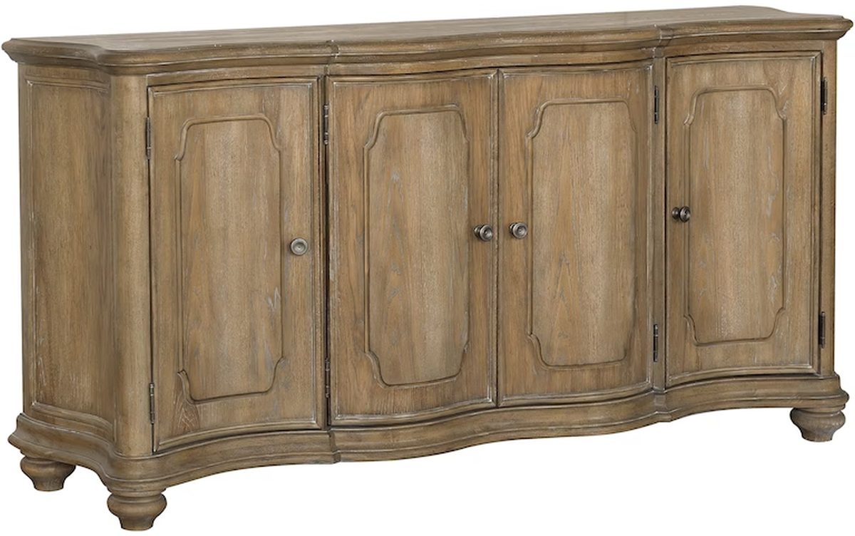 The Pulaski™ Weston Hills flax seed buffet brings classic elegance and practical storage to your dining space. Featuring a warm Flax Seed finish over cathedral hickory veneers, it offers ample cabinet space behind four doors, decorative molding, walnut inlay on top, and traditional bun feet for timeless charm.Read More
