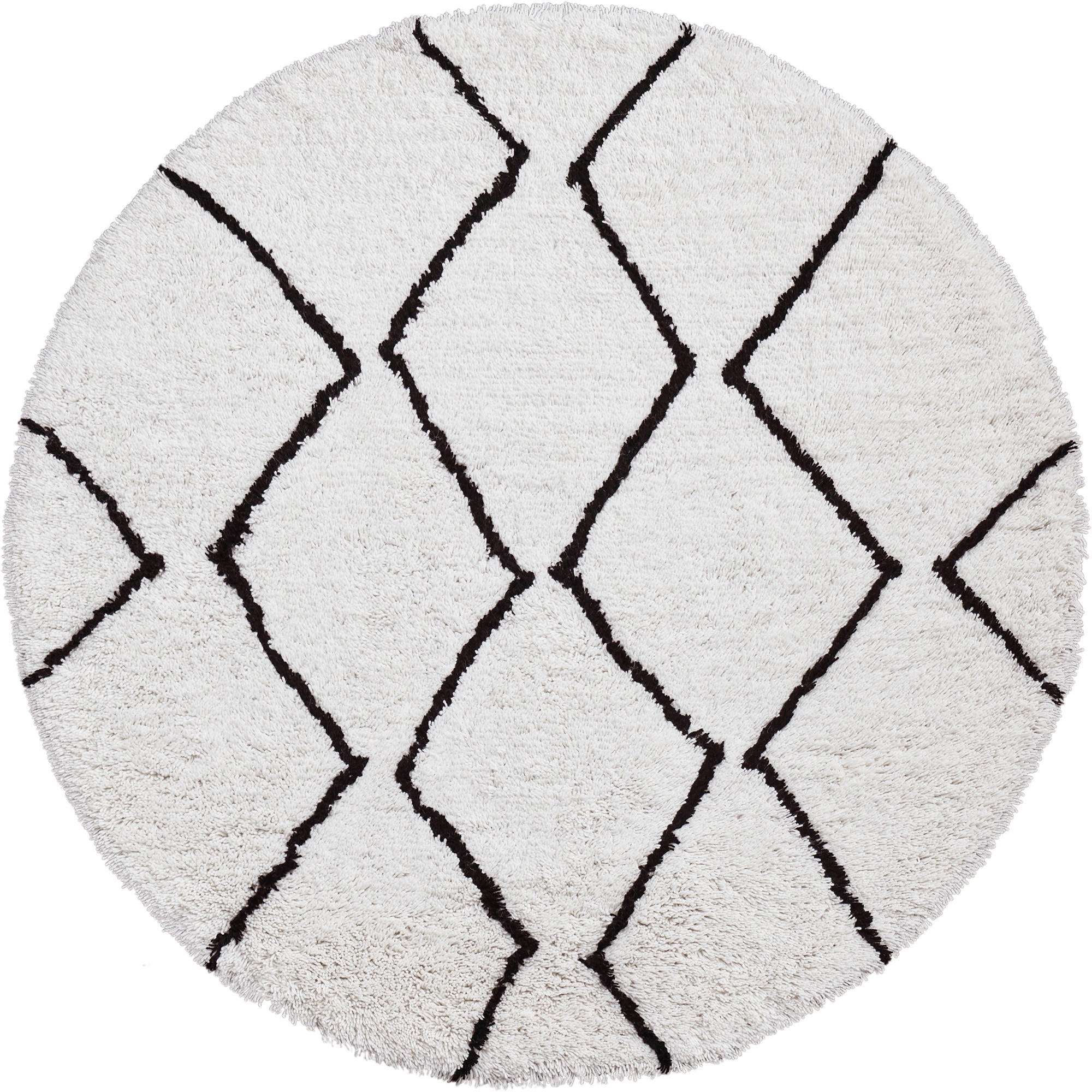 This round area rug is hand tufted with a blend of wool & cotton and features a geometric design in black & white.