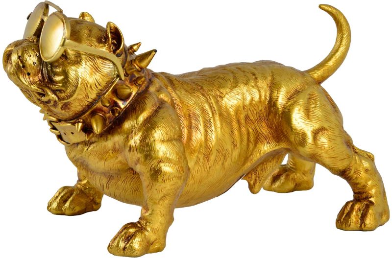 This golden dog statue is the epitome of canine cool, with its seated posture and aviator sunglasses. Cast from resin, the playful figurine of the best friend of man sits at attention all over the home on flat surfaces such as shelves and tabletops. The faithful dog preserves personal possessions as it shows up with elegant metallic gilded radiance.