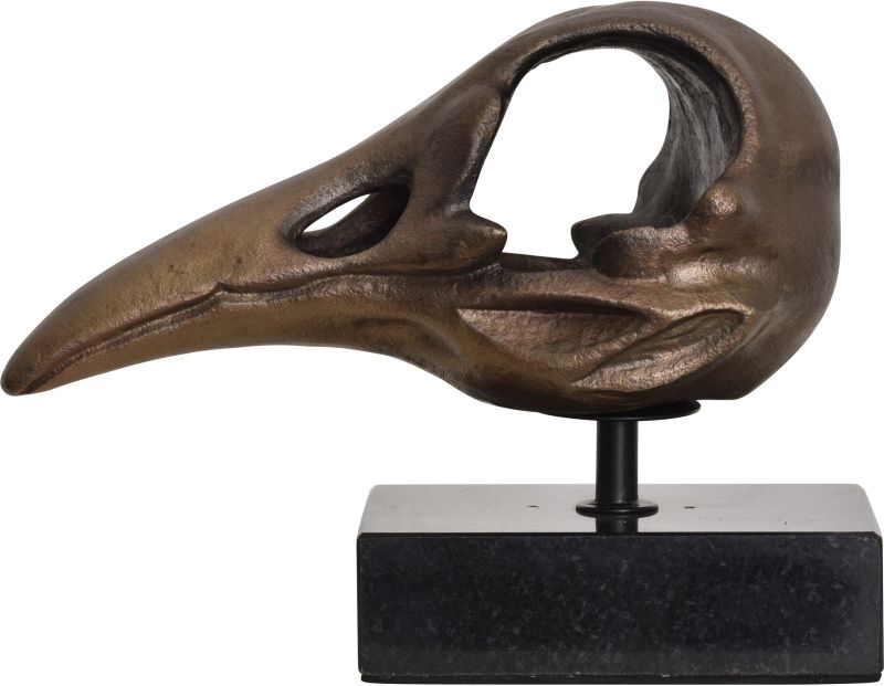 This Ravens Skull in Antique Brass will sit perfectly on top of any table or shelf as a decorative piece of art. The skull is made of aluminum and standing on top of a black granite base.