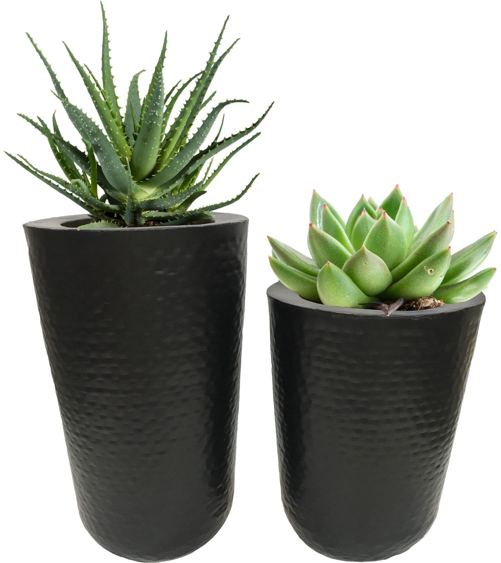 Bold in black, elevating outdoor room is fitted to these planters. With textured details which enhance the simplistic structure, this piece adds a dramatic element to the horticulture of the home. Plants are not included.