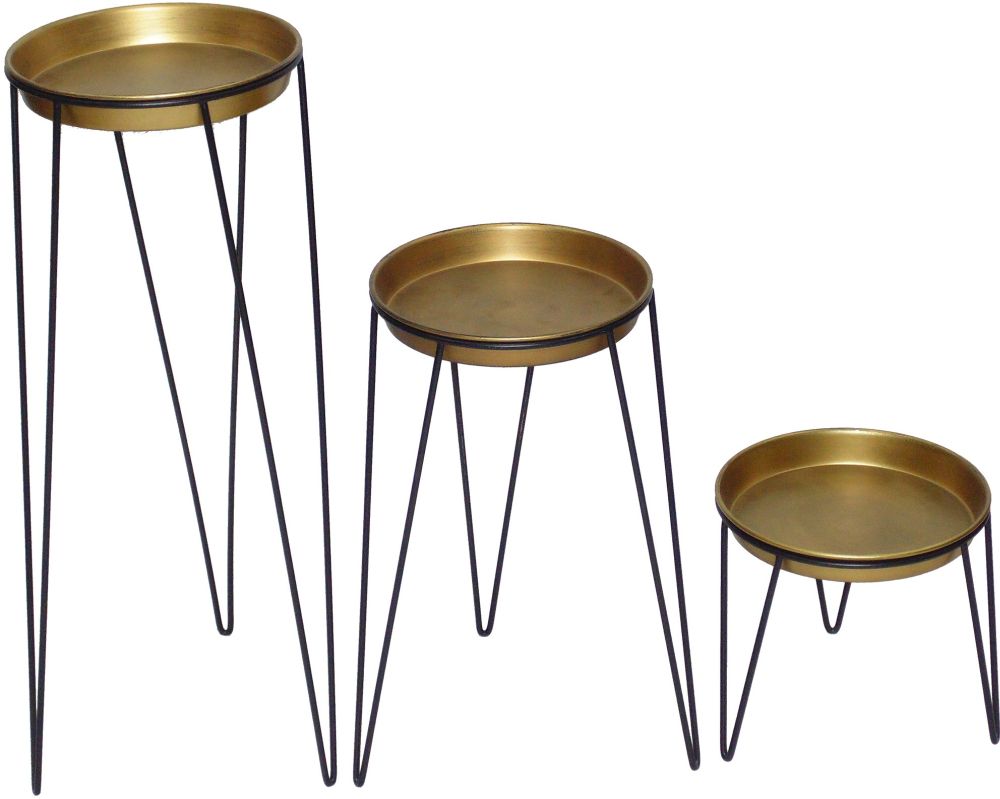 Easily show off your favorite plants or other decorative objects with these Brass and Black plant stands from the Jude's collection. Each stand has a gold round tray to help support any plant(s) or decorative objects. Stands also features long triangular black legs. This set comes in 3 different sizes.