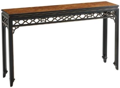 A fine ebonized and poplar burl veneered Console Table with gilt detailing, the molded edge rectangular top veneered with poplar burl, the pierced fretwork frieze on chamfered legs with Pointe feet. Ideal for entryways or living spaces, it offers both functionality and elegance, serving as a stylish surface for display or everyday use.Read More
