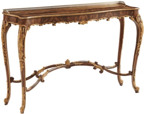 Royally inspired and delicately crafted, the Marlborough Console Table is designed with a noble serpentine edge in our Morris finish with gold details. The top displays a grand wavy X cast with brass scrolling on each side. Hand-carved acanthus leaf scroll apron sits atop slender acantus Chippendale legs.Read More