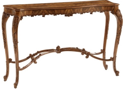 Royally inspired and delicately crafted, the Marlborough Console Table is designed with a noble serpentine edge in our Morris finish with gold details. The top displays a grand wavy X cast with brass scrolling on each side. Hand-carved acanthus leaf scroll apron sits atop slender acantus Chippendale legs.Read More
