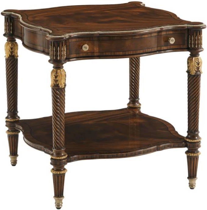 Hand-carved end table designed with serpentine edges with brass detailing atop a banded frieze drawer partnered with a fluted top over stunning hand-carved spiral twist legs