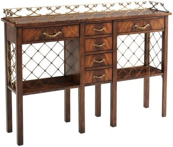 A mahogany console table, the rectangular top fitted with a finely cast three quarter gallery of crossed sabres above four central short drawers flanked by two frieze drawers fitted with hilted sabre drop handles on square supports with brass trellis back and sides. The original Regency.Read More