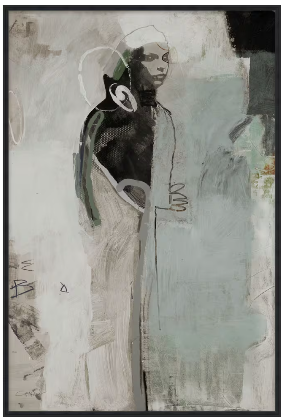 Aakasha 1 is a remarkable work on canvas displaying a striking interplay between figurative and representative styles. In the center of the composition, the viewer's gaze is immediately drawn toward a clearly defined face before trailing down toward increasingly abstracted features, scribbled writings, and geometric forms. Careful brushstrokes convey a masterful separation of subject and background that is at once distinct and blurred. A muted color palette of powder ash and grey chateau quietly convey this piece's subtle nuance. A beautiful addition to ART by TA.