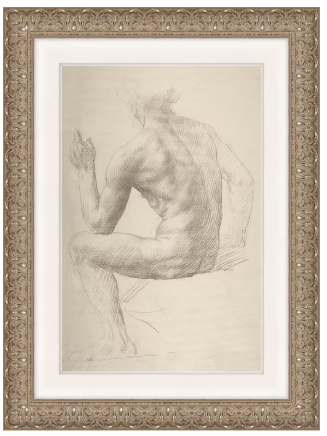 Artist's Impression is an exemplar of classical nude male figure drawing. The study in charcoal and pencil offers a focused view of the male figure from the back. Emphasis has been given to both delicate hatch lines and firm markings that combine into a textural feel. Expert shading completes the work with values that range from light to dark. A Belgique-Antwerpen deckle frame boldly completes the picture.