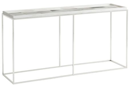 The Theodore Alexander Biscayne White Quadrilateral Console Table features a sleek, angular shape with a crisp white finish. Crafted with attention to detail, this versatile piece offers a clean, modern look that fits well in entryways or living areas, adding a touch of elegance and function.Read More
