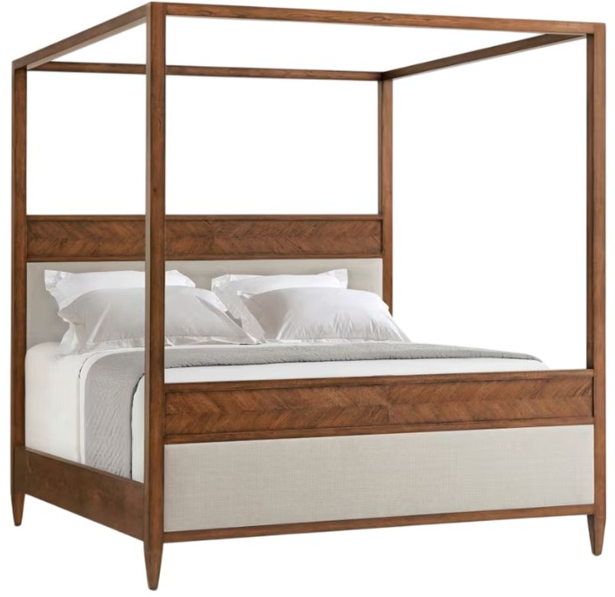 Crafted from oak and displayed in the dawn Finish, the impressive king Bed is an instant classic with its popular poster bed frame. Hand-carved oak solids and mirrored herringbone marquetry with an upholstered panel on the headboard and footboard, this bed will surely make a statement in your bedroom.Read More