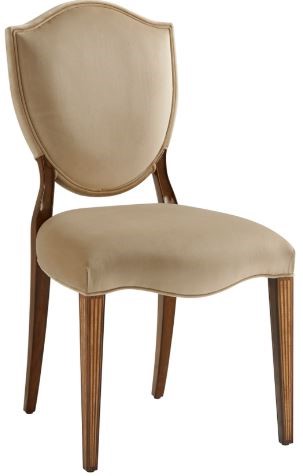 A Hepplewhite style shield back side chair, the upholstered back with flame mahogany Veneered Back Supports, the upholstered seat on square tapering legs with satinwood faux fluted inlay. Add this chair to your living room decor and elevate the look of your space.Read More