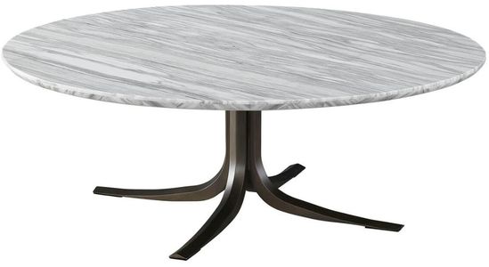 Cast aluminum legs are the sturdy base for this cocktail table’s beautifully polished calacatta marble top