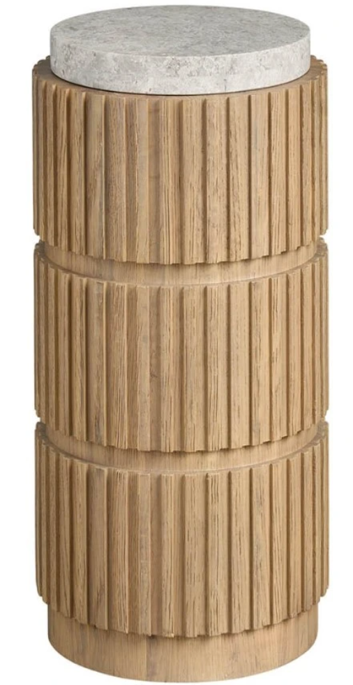 The Carmen spot table, a sleek and minimalist design, offers a unique blend of form and function. Its tall, slender silhouette, topped with a smooth stone surface, is perfect for holding a single drink or a small decorative object. The table's distinctive vertical texture adds a touch of elegance.Read More