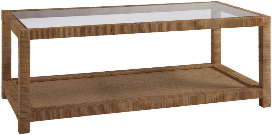A sleek, rectangular glass top and a fresh open-air display shelf is framed by an earthy, wrapped rattan in the Long Key cocktail table, a light and refreshing living room furnishing.Read More