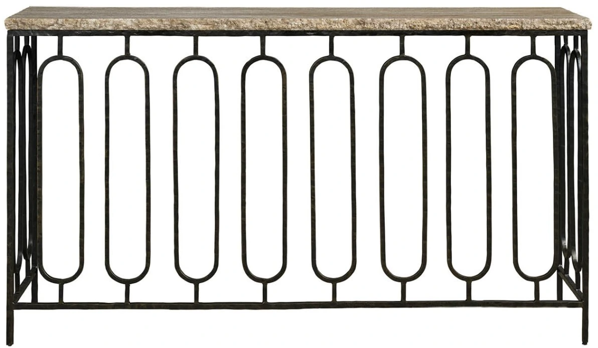 The Griffith Park Console is a stunning blend of natural and industrial elements. Its slender Gray Tavertine stone top, with its subtly chipped edges, contrasts elegantly with the intricate, oval-shaped, oil-rubbed bronze metal base. This captivating piece is a true work of art, sure to be a focal point in any room.Read More