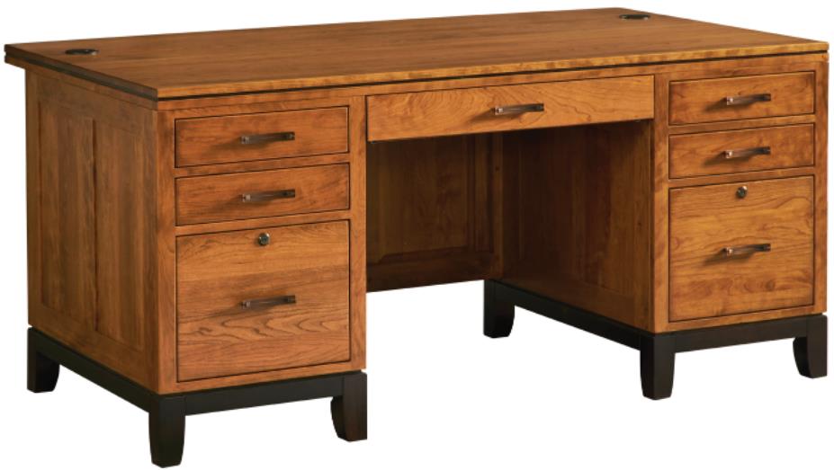 Elevate your office design with this Double Pedestal Executive Desk from Trieste Collection. Shown in retreat cherry with 104 Seely finish and 230 Onyx on bases, this item itself provides compliments to other furniture surrounding it. Make a bold statement by incorporating this stunning furniture into your home.Read More