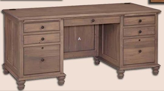 Elevate your office design with this Double Pedestal Junior Executive Desk from Wrightsville Collection. Shown in wormy maple with 232 driftwood finish, this item itself provides compliments to other furniture surrounding it. Make a bold statement by incorporating this stunning furniture into your home.Read More