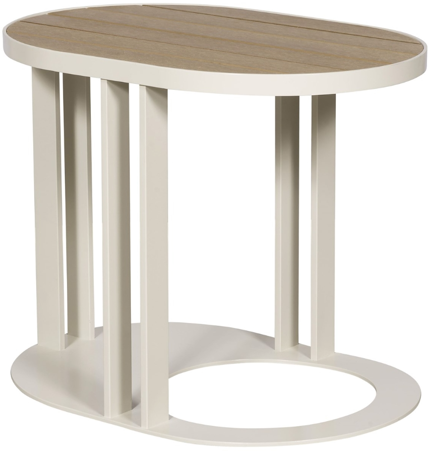 The Montecito outdoor accent table adds elegance to outdoor living with its oval sand teak top and sleek white shimmer powder-coated metal base. Customizable and durable, it offers both style and functionality for modern outdoor spaces.Read More