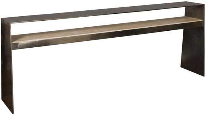 The Vanguard® Furniture Hadley Antique Silver Steel Console epitomizes contemporary elegance. With its sleek steel frame finished in antique silver, this console exudes sophistication and modern charm. The minimalist design is complemented by the subtle sheen, making it a statement piece that seamlessly integrates into any upscale living or dining area.Read More