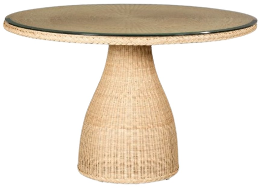 A lovely table designed in the spirit of tropical West Indies furniture from the 19th century. The round glass top rests over a split reed top over a volute shaped columnar base enveloped with intricately weaved split reed rattan peel.Read More
