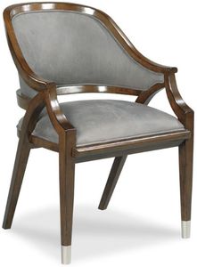 Elevate your dining room for this Belmont Chair. A comfortable upholstered barrel back descends to form curved arms above an upholstered seat raised on tapering legs ending in nickel ferrules.Read More